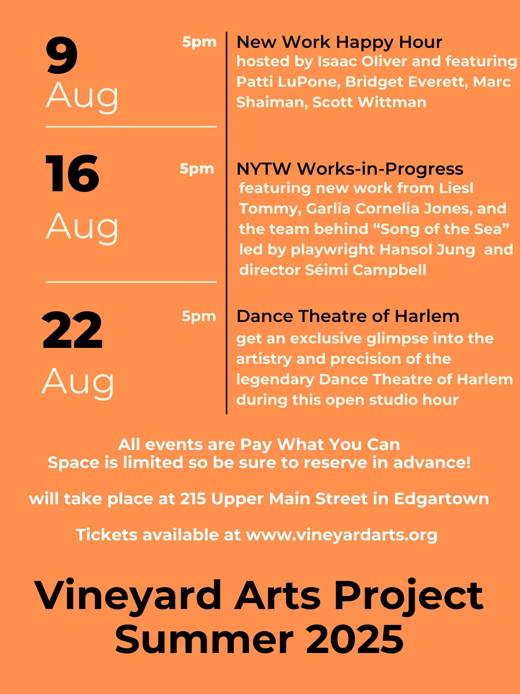 We’re thrilled to announce the return of free public programming at Vineyard Arts Project this summer in Edgartown, MA! Join us as we reopen our doors and invite you behind the scenes for an exciting season of new works in development by some of the most celebrated voices in theater and dance.